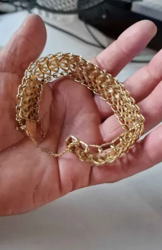 Leer descripción entera la pulsera es de oro laminado que no es oro puro la pulsera tiene una rotura la cual hay que arreglar en joyería no obstante yo daré precio bueno para quien quiera arreglarlo importante no es oro que se pueda vender al peso es oro laminado antiguo es muy bonita y el material brilla por los años no se estropea ni da alergias Elegante pulsera vintage para mujer, con un diseño macizo y un acabado brillante. - Diseño con patrón de rombos y cadenas. - Cierre de seguridad.