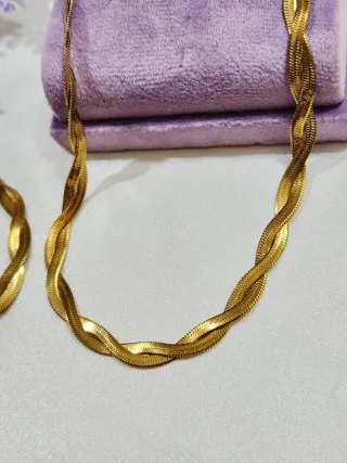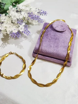 Elegante conjunto de cadena y pulsera con un diseño trenzado único. - Acero bañado en oro. - Diseño trenzado. - Incluye cadena y pulsera. Nuevos y con cajita de regalo