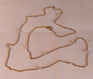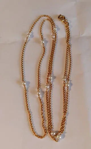 Elegante cadena chapada en oro adornada con pequeñas perlas finas distribuidas a lo largo de su longitud. Cuenta con un cierre de mosquetón para mayor seguridad.largo 70 Cms.da dos vueltas.fabricacion Suiza. - Cadena chapada en oro. - Perlas finas integradas.