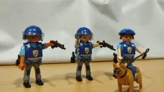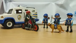 Set de Playmobil con vehículo blindado y figuras. Completo. Descatalogado y muy difícil de encontrar. Especial coleccionistas. El conjunto incluye un vehículo blindado de color blanco y azul, una motocicleta para el ladrón, cuatro figuras (dos agentes de policía, un ladrón y un perro policía), y varios accesorios como un cofre del tesoro con lingotes de oro, esposas y una cadena.
