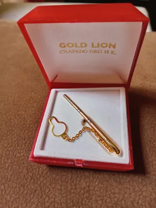 Elegante sujetacorbatas de la marca Gold Lion. A ESTRENAR CON EMBALAJE ORIGINAL - Chapado en oro de 18 quilates. - Diseño clásico con cadena. PERFECTO ESTADO Incluye cadena de seguridad. Se entrega en persona Visita mi página para ver otras ofertas