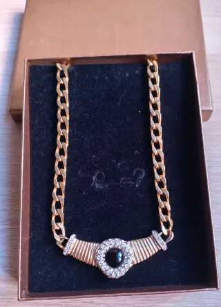 Elegante gargantilla con un diseño llamativo estilo Cartier. CHAPADA EN ORO ALTA BISUTERÍA NO SE PONE FEO MUY NUEVA USADA UNAS HORAS CON cierre de seguridad - Detalle central con circonitas y piedra negra. - Cadena tipo cubana. Se entrega en persona Visita mi página para ver otras ofertas