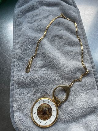 Reloj de bolsillo con cadena para sujetar a corbata o camisa. Baño de oro, funciona perfecto