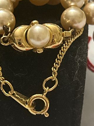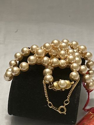 Elegante collar de perlas de la marca Manacor. Un accesorio clásico y sofisticado. - Cierre de oro chapado - Cadena de oro chapada - Perlas de color beige y dorado.