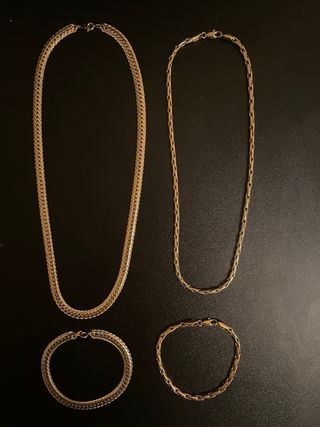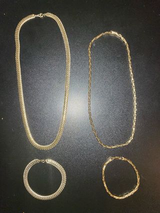conjunto de dos cadenas y dos brazaletes bañados en oro. en perfecto estado. Se venden tambien por separado