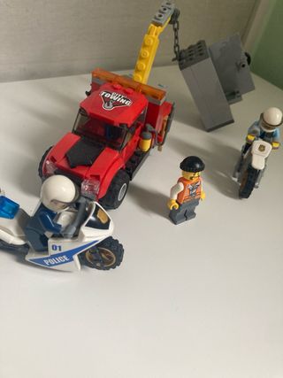 Set de construcción Lego City 60137, Camión de remolque y persecución. - Incluye un camión de remolque rojo. - Dos motocicletas de policía. - Tres figuras de Lego. - Accesorios como cadenas y dinero. - Moto roja con una minifigura y planta con lingote de oro de regalo