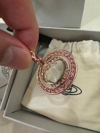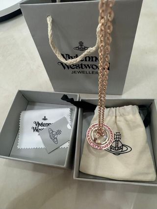 Elegante collar de Vivienne Westwood con diseño de planetas. Un accesorio llamativo y sofisticado. - Cadena de eslabones en tono oro rosa. - Colgante circular con detalles de circonitas. - Incluye bolsa de tela protectora con el logo de la marca.