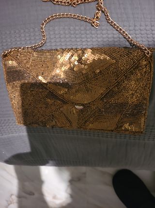 cartera stradivarius sin estrenar.Lentejuelas oro viejo.Muy cómoda y ponible tanto para fiesta como con un vaquero tiene cadena para poderla colgar