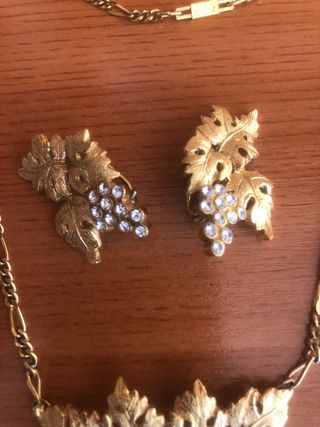 Conjunto de golfi con diseño de hojas y racimos de uvas, adornado con pequeñas piedras brillantes. - Colgante con cadena.largo 45 cm - Pendientes a juego. - Acabado chapado en oro