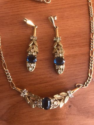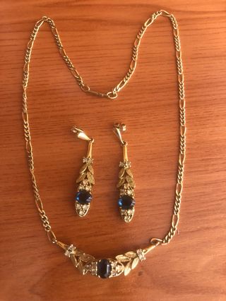 Elegante conjunto de joyería de la marca Golfi, que incluye un collar y un par de pendientes. - Diseño con detalles en forma de hoja. - Acentos de piedras azules y transparentes. - golfi oro bajo. - largo de cadena 45 cm.