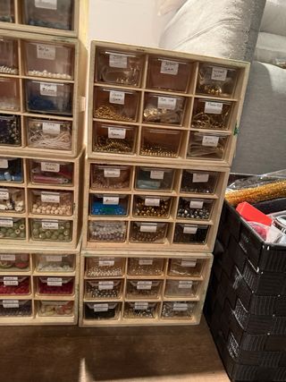 Organizador de abalorios y herramientas para bisutería. Contiene varios compartimentos con diferentes tipos de cuentas y accesorios. - Diversidad de abalorios de cristal miyuki, hilos, cierres, cadenas, y dijes en acero inoxidable, chapados en oro 18/14k y plata. y otros materiales, hay mucha variedad. - Incluye herramientas básicas para la creación de bisutería. - Ideal para organizar y almacenar materiales de manualidades. Se retira en San Sebastián. El lote se vende todo junto.