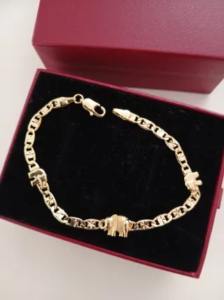 Elegante pulsera con baño de oro de 750 quilates, fabricada en Italia. Medida largo 19 cm-ancho 4mm Con cajita de regalo - Diseño con motivos de elefantes. - Cadena con eslabones texturizados. - Cierre de mosquetón seguro.