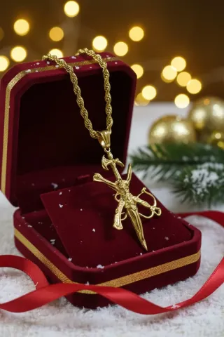 Elegante conjunto de cadena y cruz de la Legión. - Cadena con diseño trenzado. - Colgante con detalles de la Legión. - Acabado chapado en oro de 18 quilates. - Se envía en bolsita de seda para guardarla , Cajas de atrezzo para las fotos NO incluidas