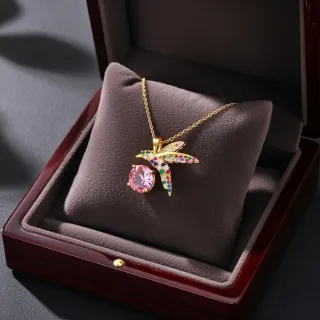 Elegante collar con colgante de colibrí adornado con piedras de colores y una gema ovalada rosa. - Colgante de colibrí con incrustaciones. - Gema ovalada de color rosa. - Cadena chapada en oro 18klt.