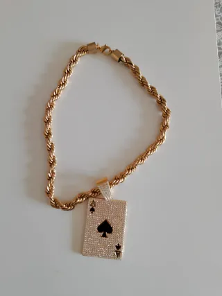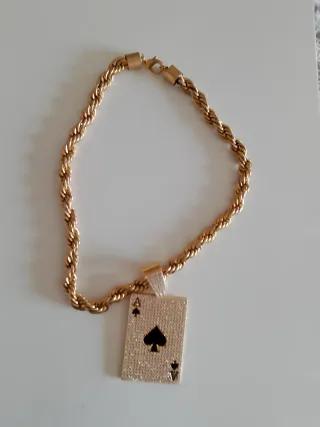 Elegante collar con cordón de oro y un llamativo colgante en forma de carta de As de Picas. El colgante está adornado con pequeñas piedras brillantes. - Cordón de oro trenzado. - Colgante con diseño de As de Picas. - Detalles de pedrería en el colgante.