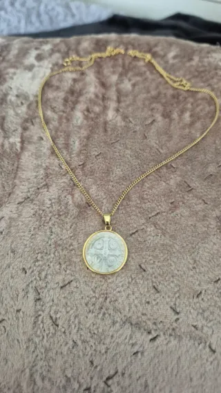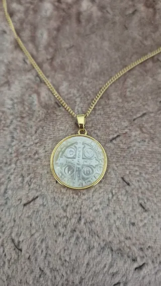 Elegante cadena chapada en oro con una medalla. - Medalla con diseño de San Benito. - Acabado en oro. - medalla de nácar. Largo 55 cm Todo chapado en oro. 0 alergias. Comprado en Joyería.