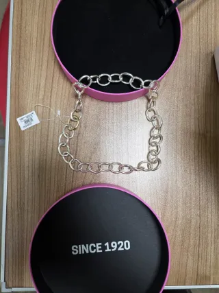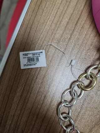 Toda metálica con un baño dorado, NO ES DE ORO, con un colgante en forma de candado. Mide unos 23 cms. puesta en el cuello, y tiene un añadido ajustable de 8 cms más. Está sin estrenar.