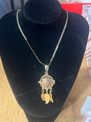 Elegante cadena laminada en oro de 14 quilates con un delicado dije de atrapasueños. - Dije con diseño de atrapasueños. - Detalles en forma de plumas colgantes. - Cadena con eslabones finos. -cadena de 45cm.