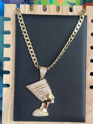 Elegante collar de 45 cm con un colgante en forma de busto de Nefertiti. El acabado es laminado en oro de 14 quilates. - Diseño detallado del busto de Nefertiti. - Cadena con eslabones tipo 'coffee bean'.