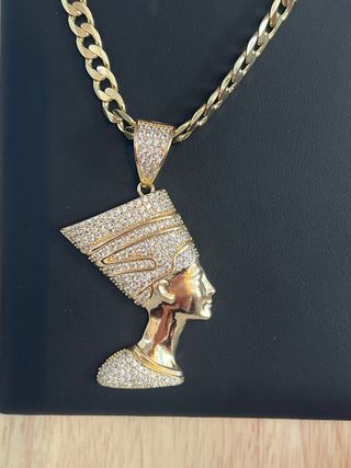 Elegante cadena con colgante de Nefertiti, laminada en oro de 14 quilates. - Diseño detallado del busto de Nefertiti. - Cadena tipo cubana. - Longitud de 50 cm.