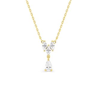 Collar de oro amarillo 9K con tres magníficas circonitas de forma marquesa de 4 x 2 mm, dispuestas para formar una curva descendente en la que la circonita más baja sostiene una piedra tallada en pera de 5 mm de altura, realzando el brillo de esta piedra central. Está equipado por una cadena de eslabón forzado de 42 cm, con anillo intermedio a 40 cm, y un peso medio de oro de 1,20 g. Este collar realzará todos tus conjuntos.