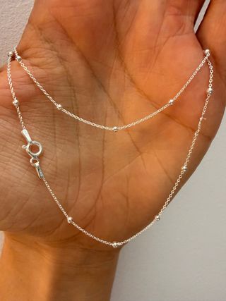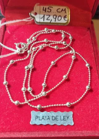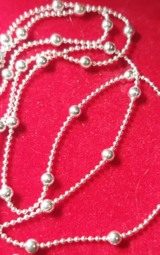 Cadena de 45cm de Plata de Ley 925. Total de peso 2,83gr. Original y Elegante de bolitas de diferente tamaño de Plata auténtica. Fíjese bien en el tamaño porque en las fotos parece más gruesa pero es FINA. Está fotografiada sobre un metro para que la midan bien antes de comprar, por favor. Tiene el cierre de reasa, auténtico de las Cadenas de Plata de Verdad.