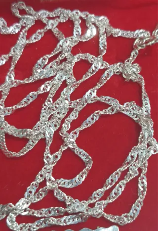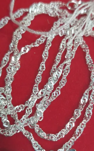 Cadena de 80cm de Plata de Ley 925. Total de peso 3,46gr. Modelo Singapur, Elegante y Clásica de Plata auténtica. Fíjese bien en el tamaño porque en las fotos parece más grande pero aunque es muy larga es DELGADA, 2mm. Está fotografiada sobre un metro para que la midan bien antes de comprar, por favor. No se aceptan ofertas porque de esa medida sólo hay una.