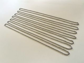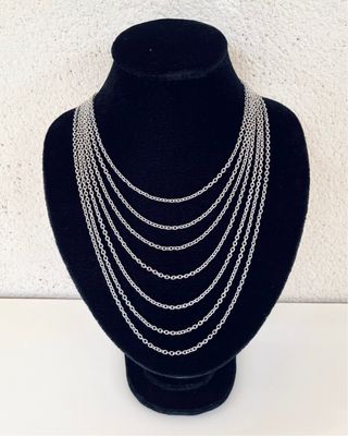 Lote de cadenas de metal plateado para manualidades. Ideales para crear bisutería y regalos personalizados. No se venden por separado, se vende el lote completo siete cadenas Longitud de las cadenas: 66 cm. NO se incluye el soporte de exhibición en las fotos, pero lo tengo disponible por separado en el perfil.