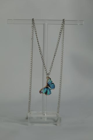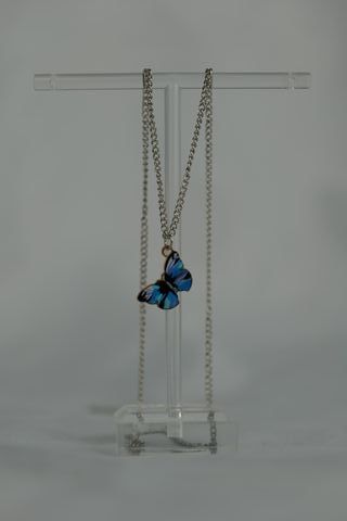 Collar elegante con colgante de mariposa en tonos azules y detalles delicados. La mariposa tiene un acabado esmaltado que resalta el color y el diseño, ideal para dar un toque bonito y femenino a cualquier look. Incluye cadena metálica en color plateado. Estado: muy bueno, sin signos visibles de uso. Perfecto para uso diario o como regalo. 📦 Se envía bien protegido.