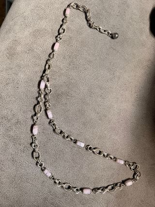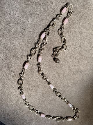 Elegante collar de bisutería con cadena de eslabones en tono plata. Presenta pequeñas cuentas rectangulares de color rosa pálido intercaladas. - Diseño de cadena con eslabones retorcidos. - Cierre de mosquetón con cadena extensora y bola. - Piezas rectangulares de piedra rosa pálido.