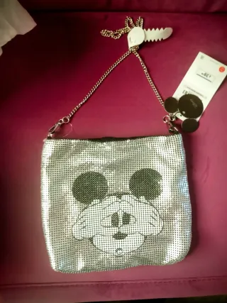 Bolso plateado con un divertido diseño de Mickey Mouse. - Acabado metálico brillante. - Cadena para llevar al hombro o cruzado. - Detalle de Mickey en la parte frontal.