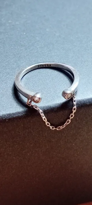 Elegante anillo de plata de ley con un diseño único y una delicada cadena que une sus extremos. Un accesorio que aporta un toque de distinción. Nuevo a estrenar Marc aale petite Marie Talla 12 - Fabricado en plata de ley. - Diseño abierto y ajustable. - Detalle de cadena.
