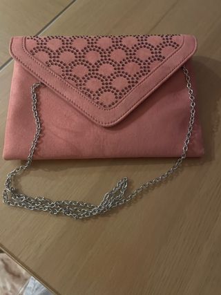 Elegante bolso de mano con un diseño moderno y detalles brillantes. Perfecto para complementar tu atuendo. - Acabado en ante. - Decoración con pequeños adornos. - Incluye una cadena fina plateada para llevar al hombro.