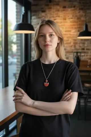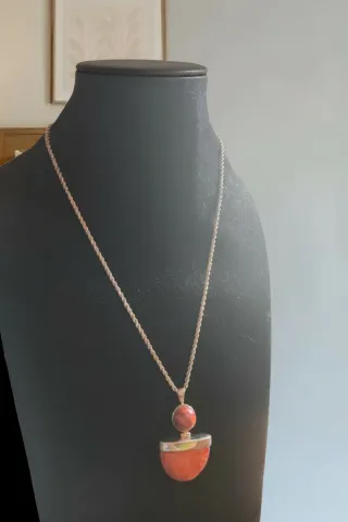 Elegante conjunto de colgante con dos piezas de coral y cadena. - Colgante con diseño de media luna y una pieza redonda superior. - Coral de color rojo vibrante. - Cadena de plata con eslabones retorcidos.