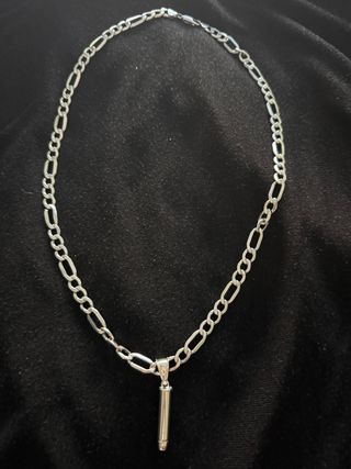 Elegante cadena de plata con un colgante cilíndrico. El diseño de la cadena es tipo Figaro, con eslabones alternos. - Material: Plata 925 - Diseño de cadena: Figaro - Colgante: Cilindro - Peso: 18,98 gramos