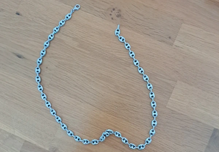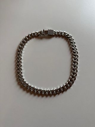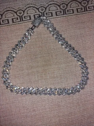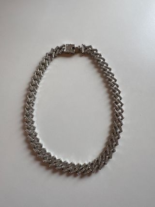 Elegante cadena cubana con un diseño llamativo. - Acabado plateado brillante. - Cierre seguro y fácil de usar. - Precio original 200€ +/- - Comprada para videoclips pero nunca llegó a usarse - Marca Aporro Acepto ofertas