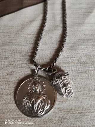 Elegante cadena con dos colgantes. - Cadena de plata. - Colgante con imagen religiosa de 33 mm - Colgante con figura de Jesucristo.