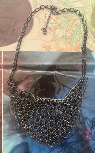 Elegante collar de cadena con un diseño de malla. - Cadena ajustable para un ajuste perfecto. - Acabado metálico en tono plateado.