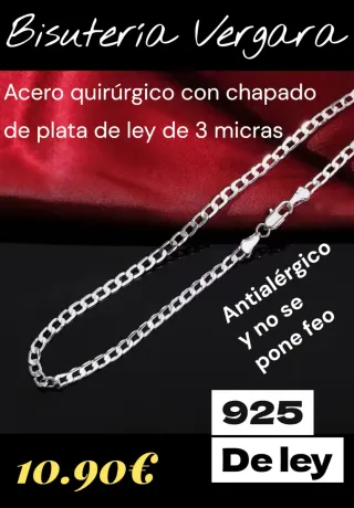Elegante cadena de Bisuteria Vergara, elaborada en acero quirúrgico con un chapado de plata de ley de 3 micras. Es antialérgica y no se pone fea. - Material: Acero quirúrgico con chapado de plata de ley. - 6mm de ancho del eslabón - 55cm de larga - Grosor del chapado: 3 micras. - Propiedades: Antialérgica, no se decolora.