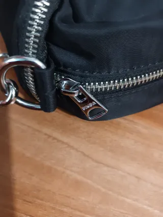 Bolso negro de la marca BIMBA Y LOLA con cadena plateada. Se puede usar con una o con las dos cadenas. Cada cadena mide 60 cm. Le he roto la etiqueta interior - Diseño moderno y versátil. - Cierre de cremallera. - Asa de cadena metálica.