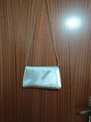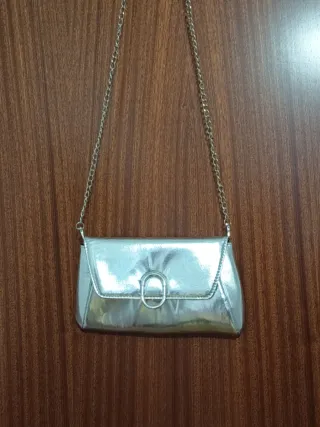 Elegante bolso tipo clutch o bandolera con acabado metalizado. - Diseño moderno y llamativo. - Cadena metálica para llevar al hombro o cruzado. - Cierre de solapa con detalle de aro. ACEPTO OFERTAS