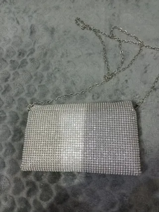 Elegante bolso de mano con un diseño brillante y una cadena metálica. - Acabado con pedrería. - Cadena desmontable para llevar al hombro o como clutch.