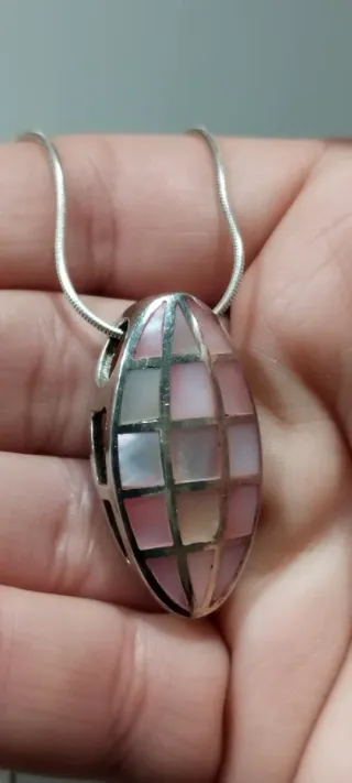Elegante colgante con diseño geométrico, elaborado en plata y Nácar. Cadena de 20cm. - Incrustaciones en Nácar tonos rosa. - Cadena de plata incluida. - Con sello 925.