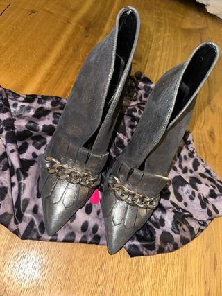 Elegantes zapatillas de tacón con un diseño moderno. - Acabado metalizado plateado. - Detalle de cadena dorada en la parte delantera. - Puntera afilada. - Adorno de flecos.