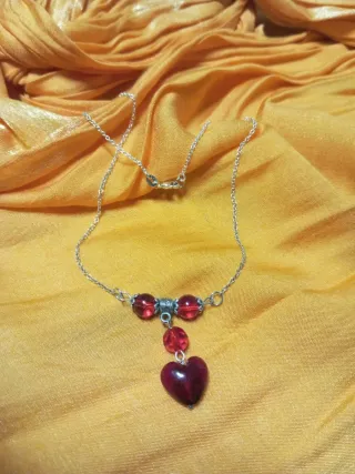 Elegante collar con colgante de corazón y detalles en cuentas rojas. - Cadena de plata. - Colgante en forma de corazón. - Cuentas decorativas rojas.