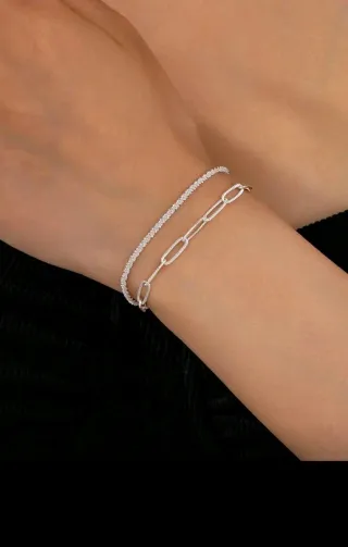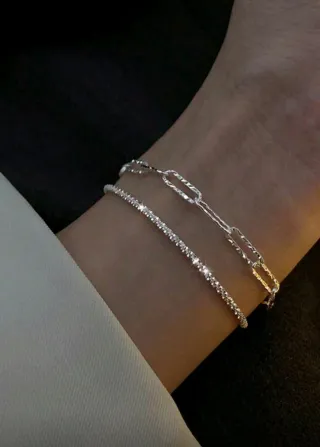 Elegante pulsera plateada con un diseño de dos piezas. - Una cadena con eslabones alargados. - Otra pulsera fina adornada con pequeñas circonitas sintéticas brillantes.