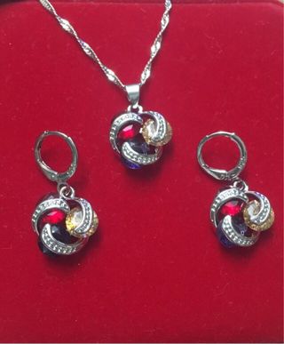 Elegante conjunto de joyería de plata con un diseño vibrante. - Colgante con cadena. - Pendientes a juego. - Detalle de piedras de colores.
