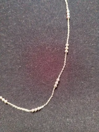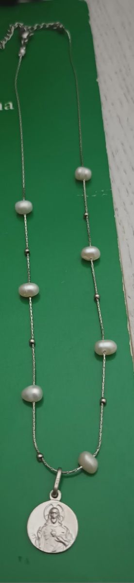 Elegante cadena de plata adornada con perlas y una medalla. - Cadena de plata. - Perlas intercaladas. - Medalla de plata con diseño religioso.