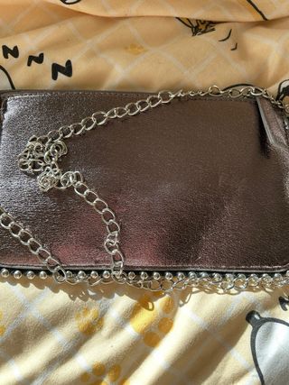 Bolso con un acabado plateado brillante y detalles de cadena. - Diseño moderno y llamativo. - Cadena metálica para llevar al hombro o cruzado. - Costuras decorativas en el borde.