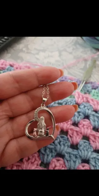 Precioso colgante de acero con diseño de corazón, una mujer sentada con dos gatos. Totalmente nuevo - Detalle de circonitas en el borde del corazón. - Cadena de acero. - Diseño único y tierno.